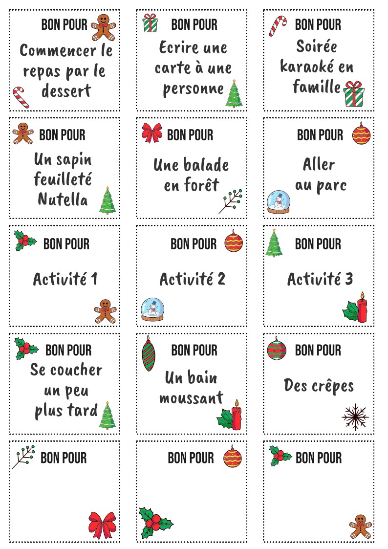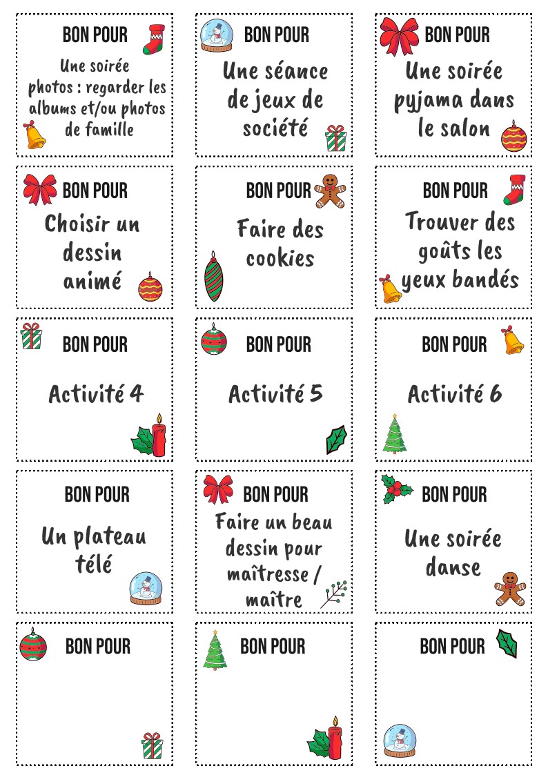 Le kit est garni avec des bons que les enfants pourront placer à leur guise dans les jours de leur choix. Des bons vierges sont à leur disposition s’ils veulent personnaliser une activité. 6 activités créatives et 2 recettes sont prévues. Le matériel leur sera fourni.