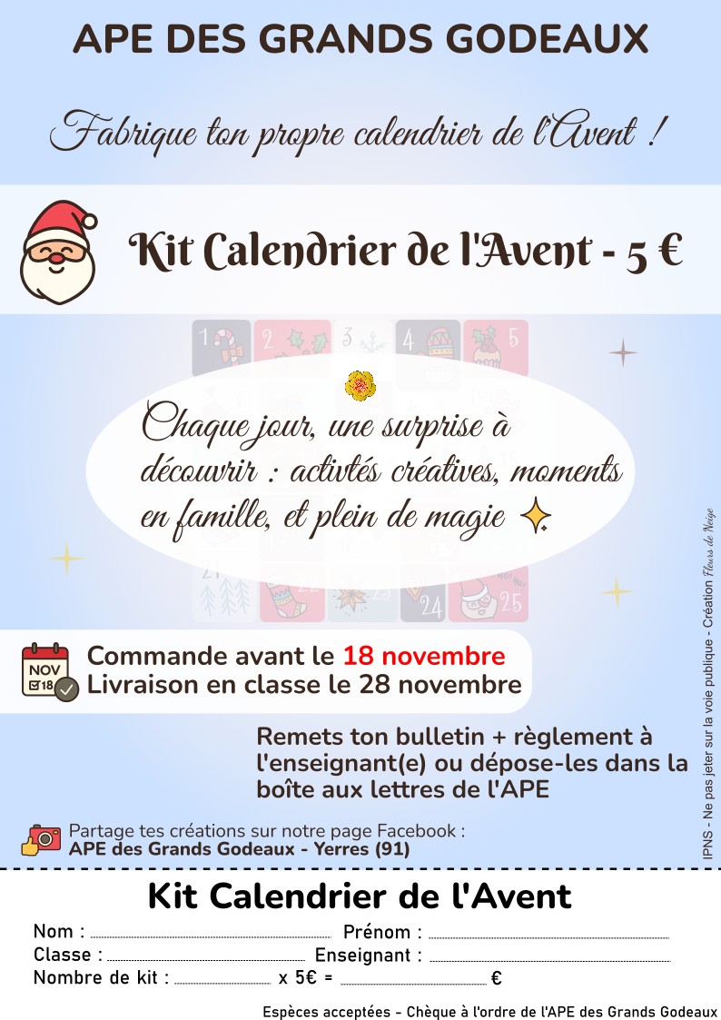 L’APE des Grands Godeaux vous propose un kit créatif à seulement 5 € pour fabriquer votre propre calendrier de l’Avent