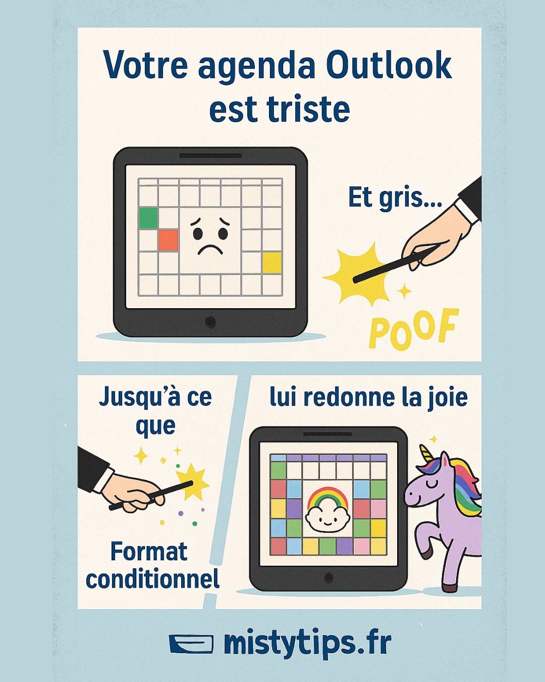 #OutlookTips #FormatConditionnel #Mistytips #AgendaEnCouleurs #MulotBlessé #DigitalWorkplace #HumourDeBureau #TrucsEtAstuces