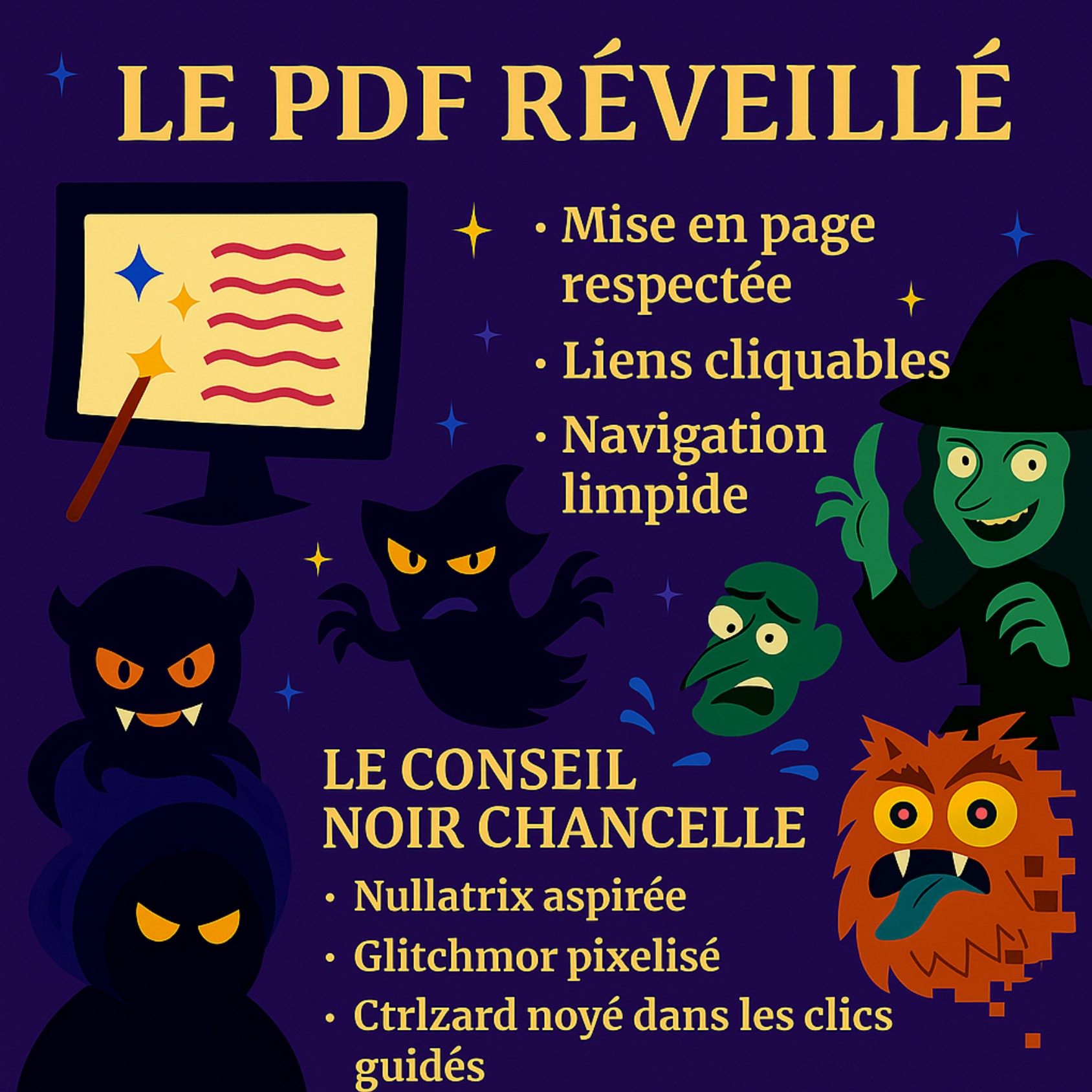 Le Conseil Noir attaque tes PDF… mais Misty’tips lance le sort de clarté ! Fichiers vivants, clics brillants, chaos vaincu.